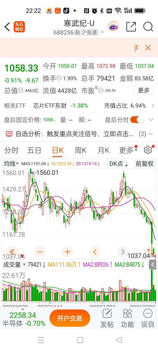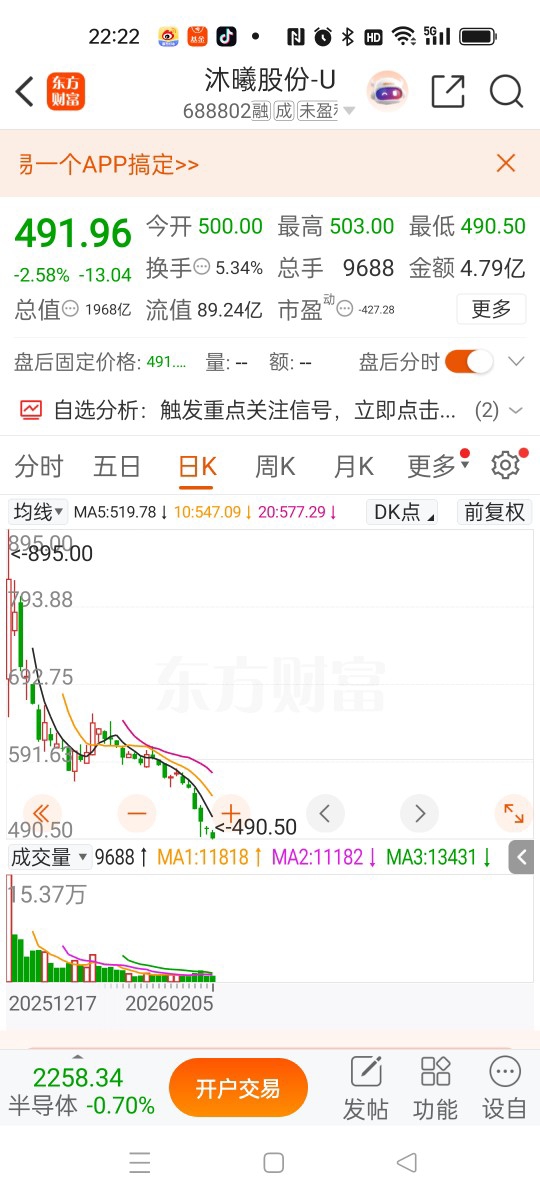 另两个股票是沐曦股份和摩尔线程,这两个新股票,从高价募集到上市,套牢了多少机构和大户,从最高价算起,几乎要对折了,非常的惨。