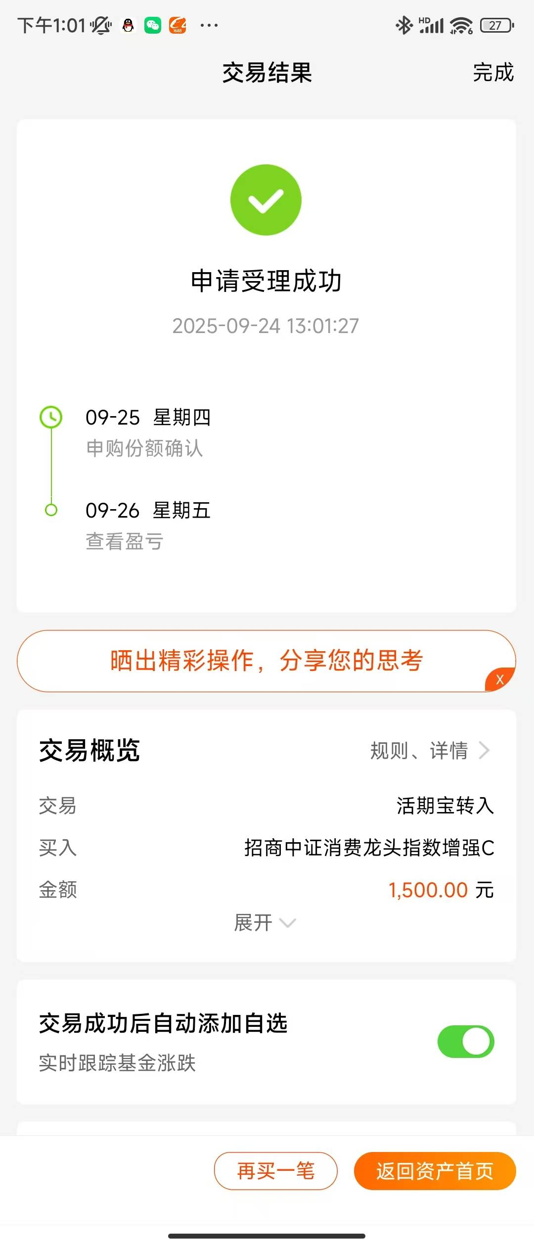 消费行情降至,提前布局一下!马上就是双节小长假,身边的小伙伴已经开始在规划行程了,有周边游的也有计划出远门旅游的,历年小长假都是旅游、消费的旺季,这势必会推动消费行情,今天加了点$招商中证消费龙头指数增强C(OTCFUND|011854)$,这只基金重点配置食品饮料、家电等必要消费,都是刚需,确定性更高,适合长期投资。