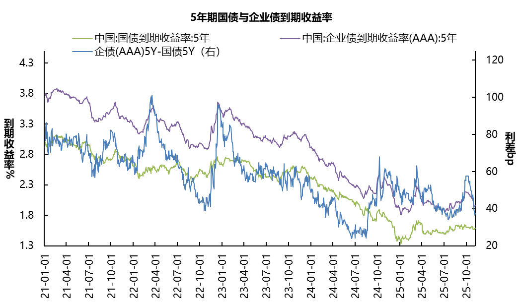 信用债方面,2025/11/03至2025/11/09,中证5年期企业债到期收益率(AAA)基本持平于1.96%;5年期企业债(AAA)与国债利差由39.71bp下行至37.45bp。