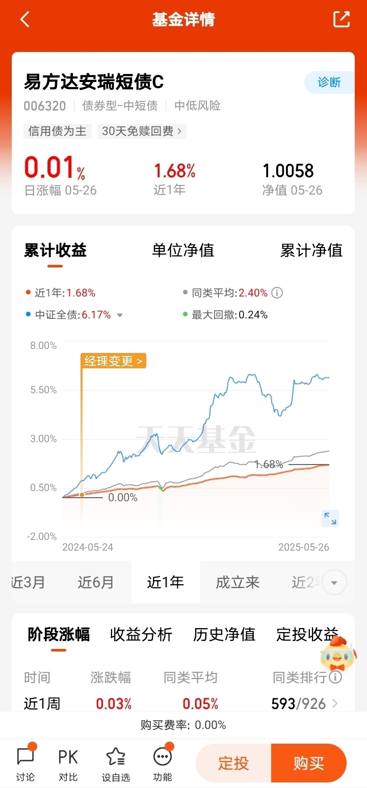 我比较看好$易方达安瑞短债C$ 基金,该基金投资以信用债为主,属于中短债基金,风险等级为中低级。目前C类基金买入免赎回费,持有满30天卖出也是免赎回费。交易费用相对较低,比较适合我这种投资风格相对稳健的投资者。
