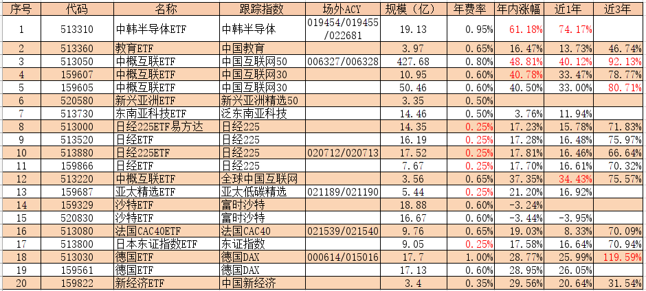 从近1年涨幅看,前三只分别为中韩半导体ETF(513310,74.17%)、中概互联ETF(513050,40.12%)、中概互联ETF(513220,34.43%);