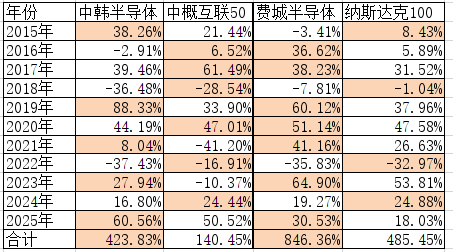 将上述两个指数与费城半导体和纳斯达克100对比看,短期两者可能领涨,但长期业绩仍逊色后者不少,只能作为阶段性仓位配置。