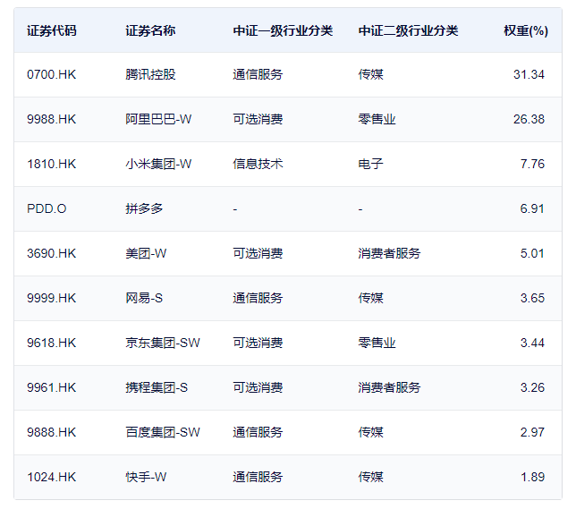 指数的十大权重股如下(合计权重92.61%,其中腾讯、阿里和小米合计65.48%):