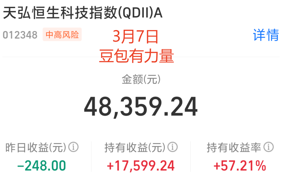 目前我恒生科技的持有收益已经超过了55%,距离突破60%越来越近。因为前面几个季度一直都在分批定投抄底,买进的点位都是历史低位区域,所以当下我有足够多的收益垫了,持有起来压力很小。