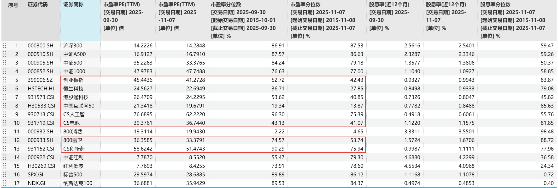 中国互联网50(估值分位13.87%)、恒生科技(估值分位27.85%)、港股通科技(估值分位40.85%)、中证电池主题指数(估值分位41.07%)和创业板指(估值分位42.43%)。