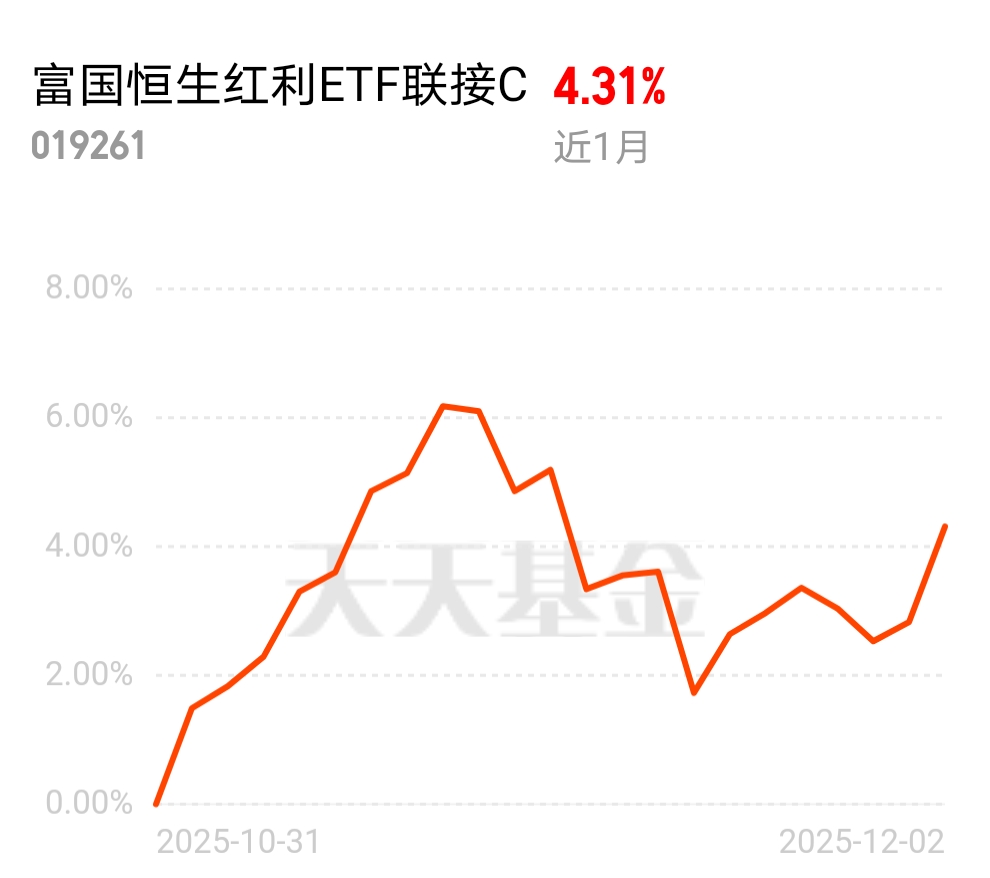这阵子海外互联还在磨底,顺手加了点富国恒生红利C,近1个月涨了4%,近1年30%