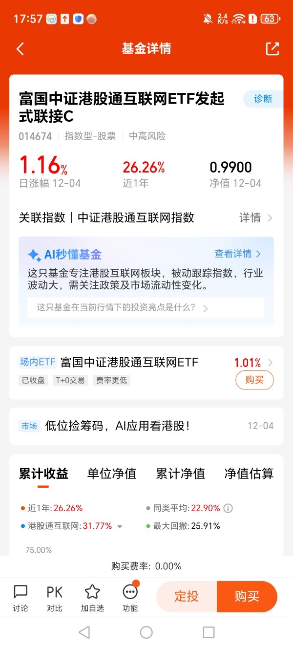 最近易方达中证海外互联一直跌,就多看了眼富国中证港股通互联网ETF联接C——盘子大,管着106亿,投的是港股电商、社交、游戏这些回暖主题;政策暖风频吹,估值又低,南向资金也在买。富国中证港股通互联网ETF联接C现在配置,感觉安全边际足了些。