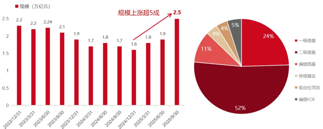 数据来源:Wind,中金公司研究部,“固收+”基金包括全部二级债基、偏债混基、转债基金、偏债混FOF,以及近八期权益仓位均值不超过40%的灵活配置、近八期有转债仓位的一级债基,右侧百分比表示各细分类型基金在2025Q3的规模占比。