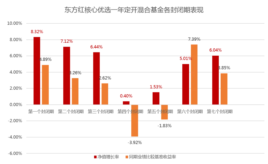 注:以A份额为代表展示业绩,东方红核心优选定开混合基金(A类)每个封闭期业绩、业绩比较基准和回撤数据均经过托管行复核。第一个封闭期(2018.10.09—2019.10.08),第二个封闭期(2019.10.23—2020.10.22),第三个封闭期(2020.10.31—2021.10.31),第四个封闭期(2021.11.17—2022.11.16 ),第五个封闭期(2022.12.15—2023.12.14),第六个封闭期(2024.01.03—2025.01.02),第七个封闭期(2025.01.23—2026.01.22)。