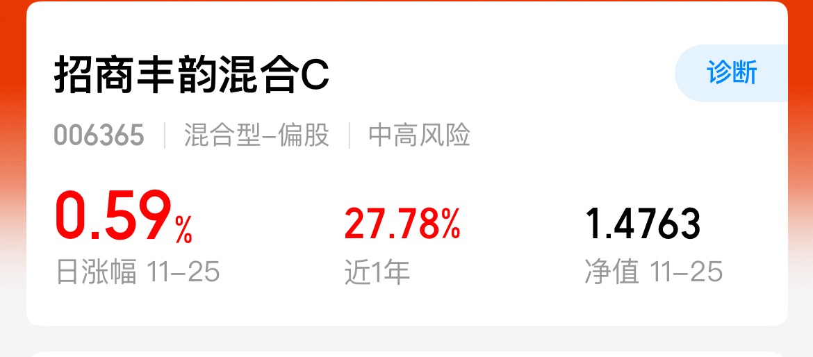 虽然说大A这边近期有所震荡,但是有个好消息就是港股那边终结了六连阴,最近的行情还是比较给力的,不少创新药的股价还在节节攀升,我关注到的这一个$招商丰韵混合C$ 基金他专门聚焦A + H股创新要板块能够精准抓住这个稀缺赛道的机会,而且这个标的估值还不是很高,业绩做得也不错,我感觉这波行情应该刚刚起来