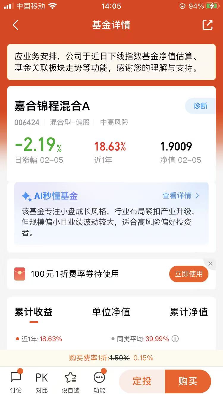 看好嘉合锦程,其实没有什么高大上的理由,全是从我们普通投资者最关心的点出发的。首先就是稳,这也是我买基金最看重的一点——毕竟咱投的是闲钱,不是赌徒式的投机,亏不起也耗不起。查过嘉合锦程的过往表现,截至2月5号,A类净值1.9009,近一年涨幅18.63%,近六个月也有18.43%的收益,虽然偶尔也会有波动,比如2月5号当天跌了2.19%,近一个月波动5.84%,但整体走势比较平缓,没有那种大起大落的心跳感。