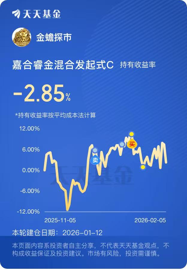 #抓马 2026 Pick 你心中的王牌赛道#作为一个没什么专业投资背景的普通人,买基金全靠慢慢摸索,踩过坑,也稍微尝到过一点甜头。目前持有嘉合基金旗下的$嘉合睿金混合发起式C(OTCFUND|005091)$,持有一段时间下来,整体还算满意,这样让我开始关注嘉合基金旗下的其他产品,其中$嘉合锦程混合A(OTCFUND|006424)$和$嘉合锦程混合C(OTCFUND|006425)$,是我近期比较看好的基金。