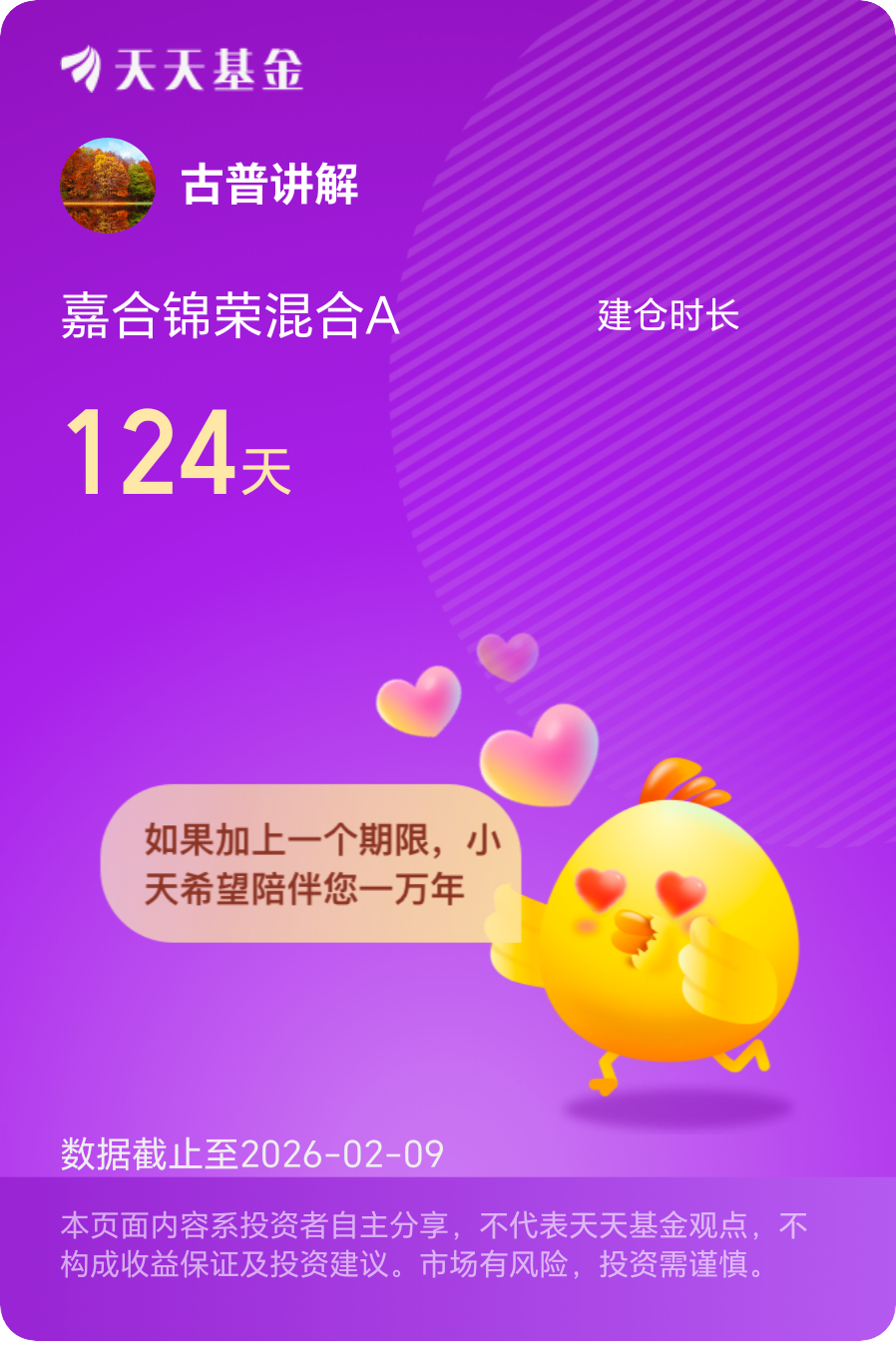 持有嘉合锦程混合A,让我学会摒弃短期投机思维,坚守长期投资理念。不被单日涨跌干扰心态,不被短期调整动摇信心,专注产业基本面与基金长期业绩,以时间换空间,陪伴优质产业与优质基金共同成长。这种投资心态的转变,比短期收益更有价值。