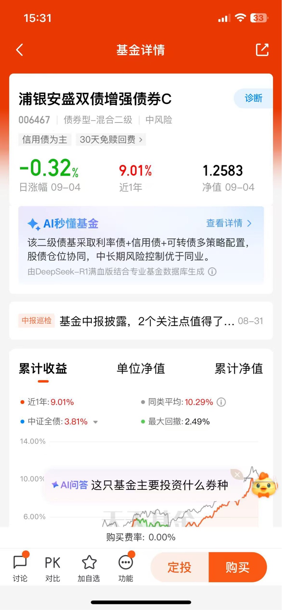 牛市多暴跌,太考验心态了,配置还是均衡点更稳,选择的这个$浦银安盛双债增强债券C$ 增强就不错,近1个月收蛋125个,近1年收益9.01%