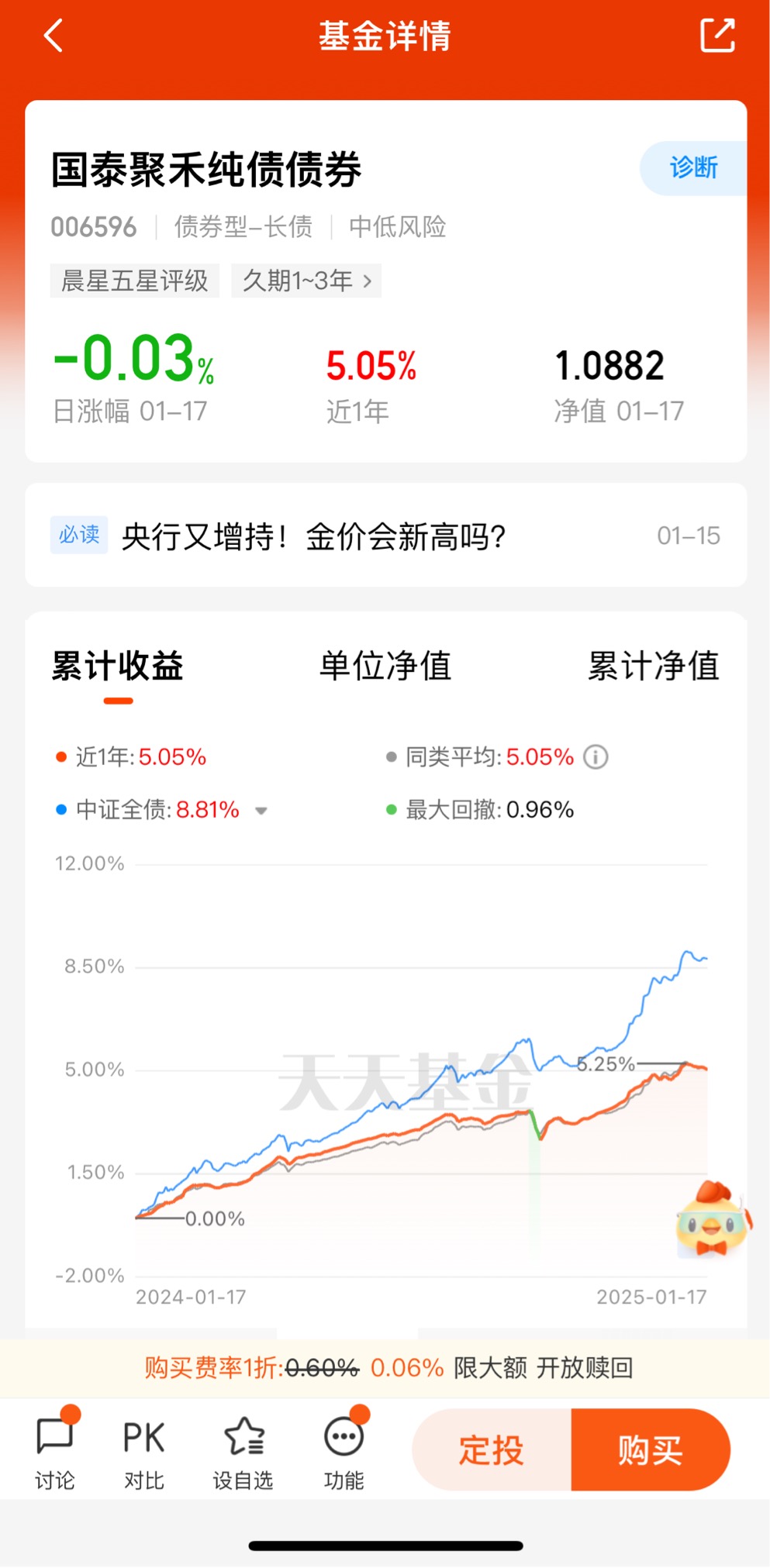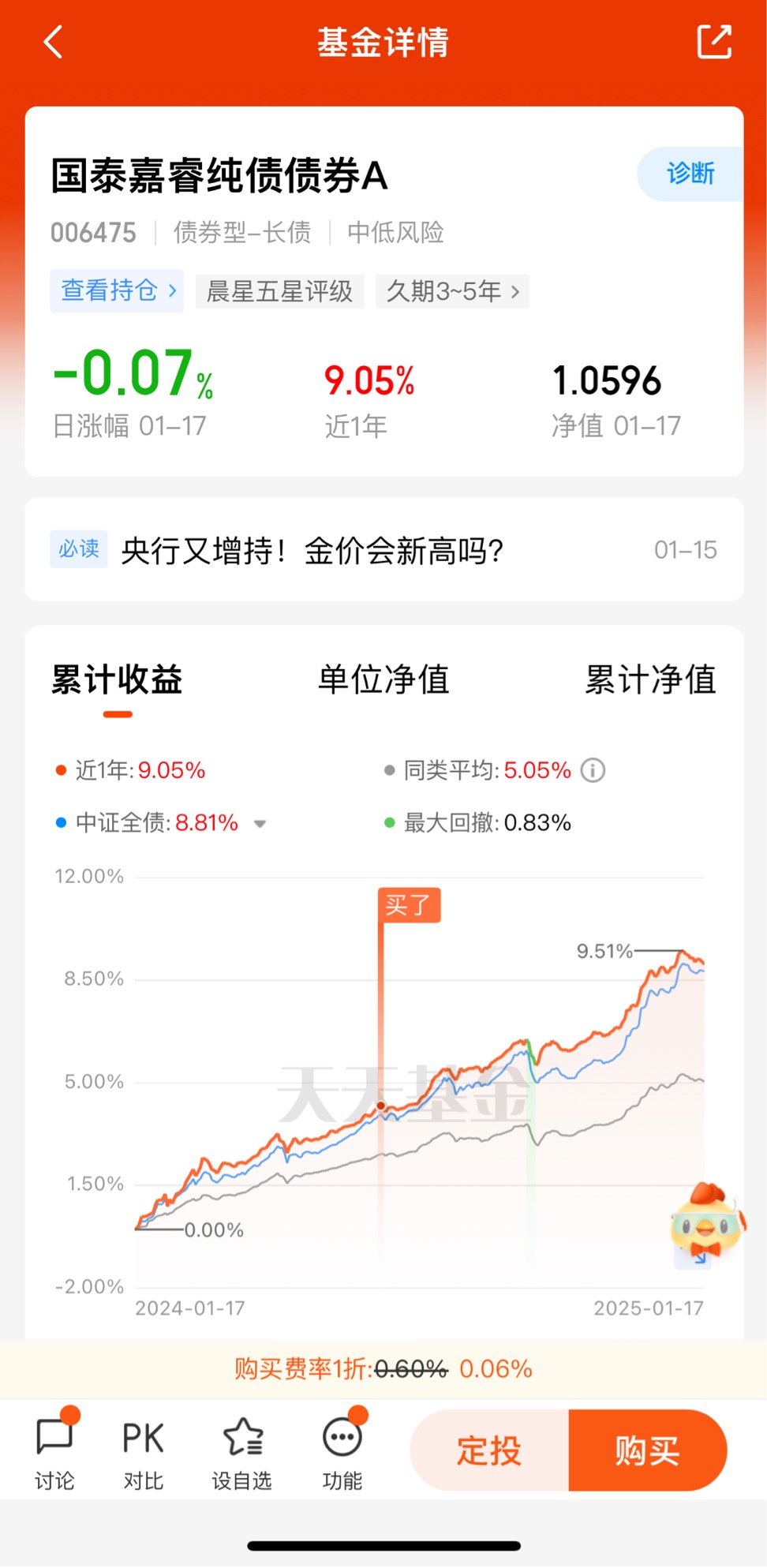 国泰嘉睿纯债债券A于2018年10月成立。2019-2024年连续6年获得正收益。长期收益稳健;产品近1年收益率达9.05%,跑赢同类97%的基金,业绩表现亮眼。国泰嘉睿纯债债券A是中低风险纯债型基金,追求稳健,过往回撤控制出色,力争为投资者提供更舒适的投资体验。虽然近期债市有所波动,但长期行情仍值得期待,优选债基产品布局,适当优化投资组合结构。@国泰基金
