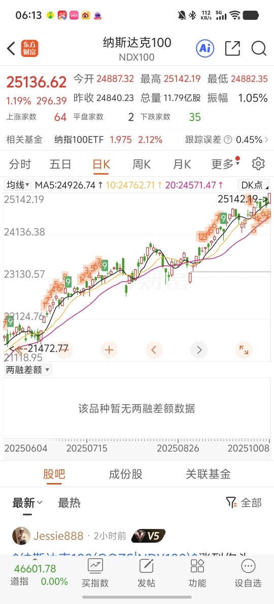 10月8日净值,纳斯达克100约涨1.19%,汇率没开,股市高开走高。昨夜今晨, 在“AI投资泡沫”的担忧加剧之际,英伟达CEO黄仁勋发声安抚市场,一众AI巨头应声上涨,将纳斯达克指数和标普500指数推至又一个历史新高。