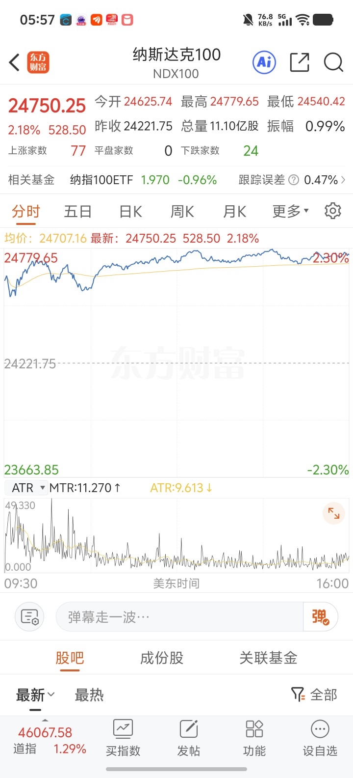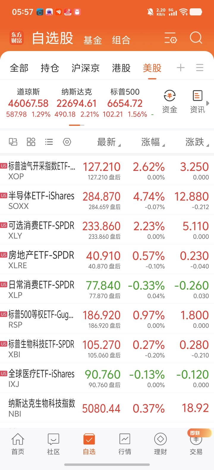道指涨587.98点,涨幅为1.29%,报46067.58点;纳指涨490.178点,涨幅为2.21%,报22694.608点;标普500指数涨102.21点,涨幅为1.56%,报6654.72点。