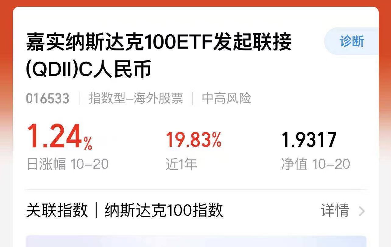 就像我手里拿着的$嘉实纳斯达克100ETF发起联接(QDII)C人民币$ ,网罗苹果、微软等100家全球顶尖创新企业,涵盖AI、云计算等前沿领域,堪称科技创新的风口。今晚纳指更新让人亮眼,收1.24%,近一年收19.83%,拉长线来看,美股还处于低位,后期我觉得美股应该能再涨,现在先加自选看看了。