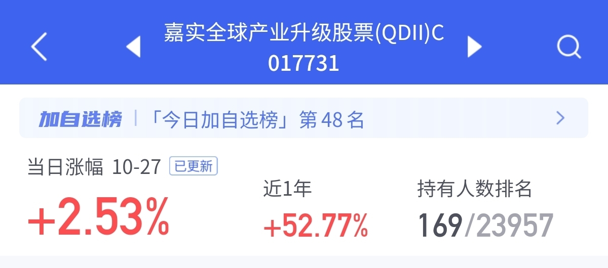 正规!今日权益市场震荡但是这个$嘉实全球产业升级股票(QDII)C$逆势上涨2.