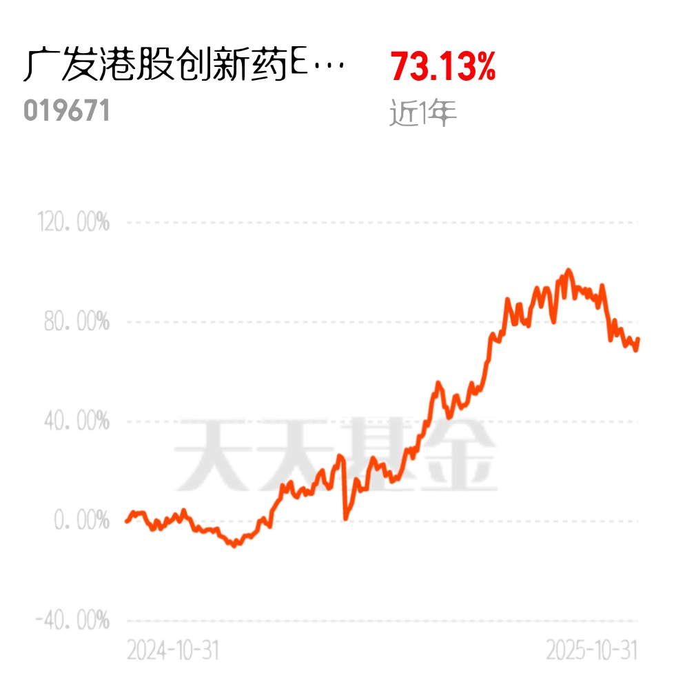 看样子这轮牛市还没过去,创新药估计马上回弹上涨,能1年站上73%涨幅的基都不一般,看好$广发港股创新药ETF联接(QDII)C$