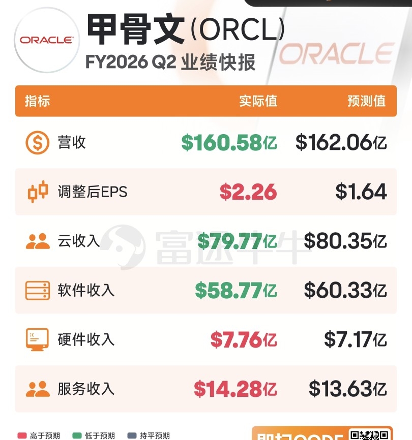 甲骨文2026财年Q2营收为161亿美元,同比增长14%,调整后每股净利润为2.26美元,同比增长54%。营收低于市场预期,目前盘后跌超8%,大概率会影响今晚AI科技股啦,另外今晚才能看到市场对议息会议的判断,因为公布时间临近收盘,所以市场都会比较混乱,今晚才能真正看清市场炒作。