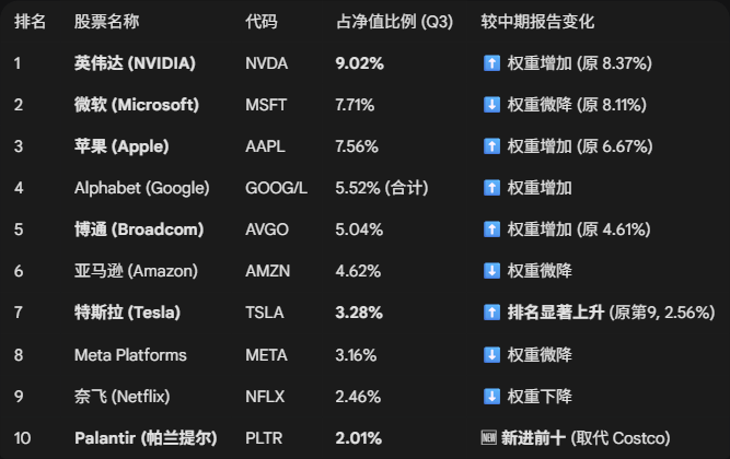 看了美联储的“看多经济”发言,开启定投美股“当家花旦”的26年征程,虽然由于限购,量很小,不过态度要摆出来,之后我也会多找产品补量的。我看了下 广发纳斯达克100ETF这个科技指数产品, 最新Q3报告现实规模为290.20 亿元 (较年中报告的266.99亿元增长约 8.7%)。前十大重仓股与年中报告相比,基本稳定“七姐妹”(英苹微亚谷特脸)依然在线且权重更加集中,且个别席位发生了更替,Palantir (帕兰提尔) 强势进入前十,挤掉了开市客 (Costco)。【详见末尾图片】虽然我个人并不看好美国方面同意让英伟达出售先进芯片给我国会带来格局性的改变,但科技领域强者恒强在商业和资本市场占优势的逻辑依然在线,只要经济能正常发展和更好的融入AI提效,依然是可期的。