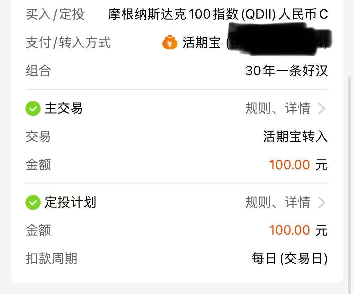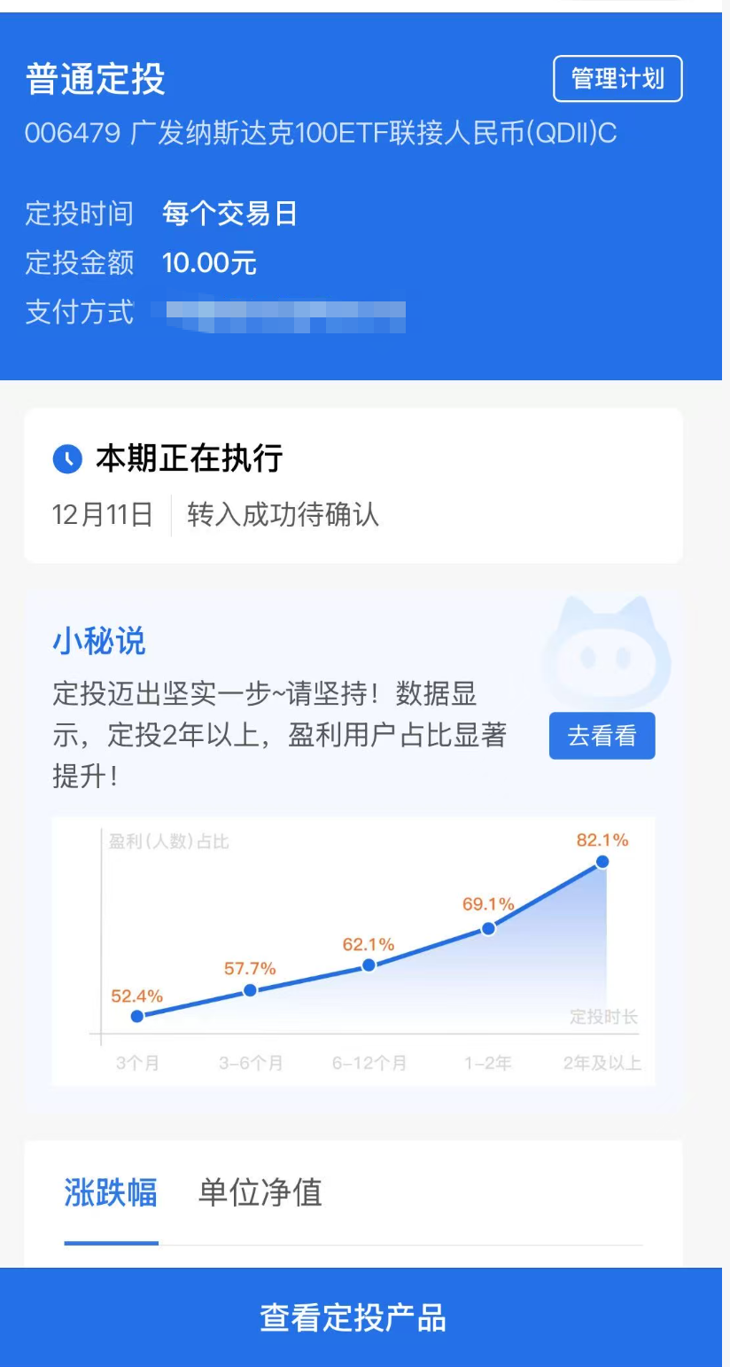 这个产品和广发纳斯达克100对标的指数是一样的,底仓最多是跟踪误差更大,因为成立更晚,规模比广发小。不过凡事都有两面性,它每天目前可以最多定投100元,着急和我一样想赶紧再配的,可以把它当作“补仓通道”
