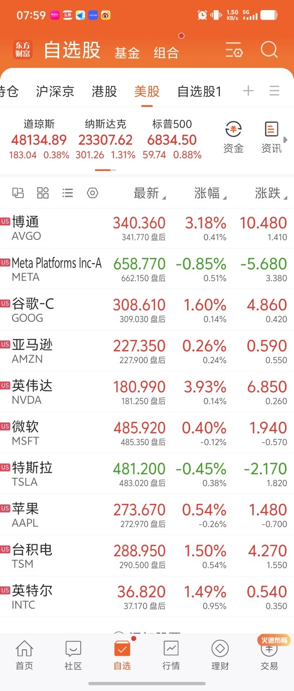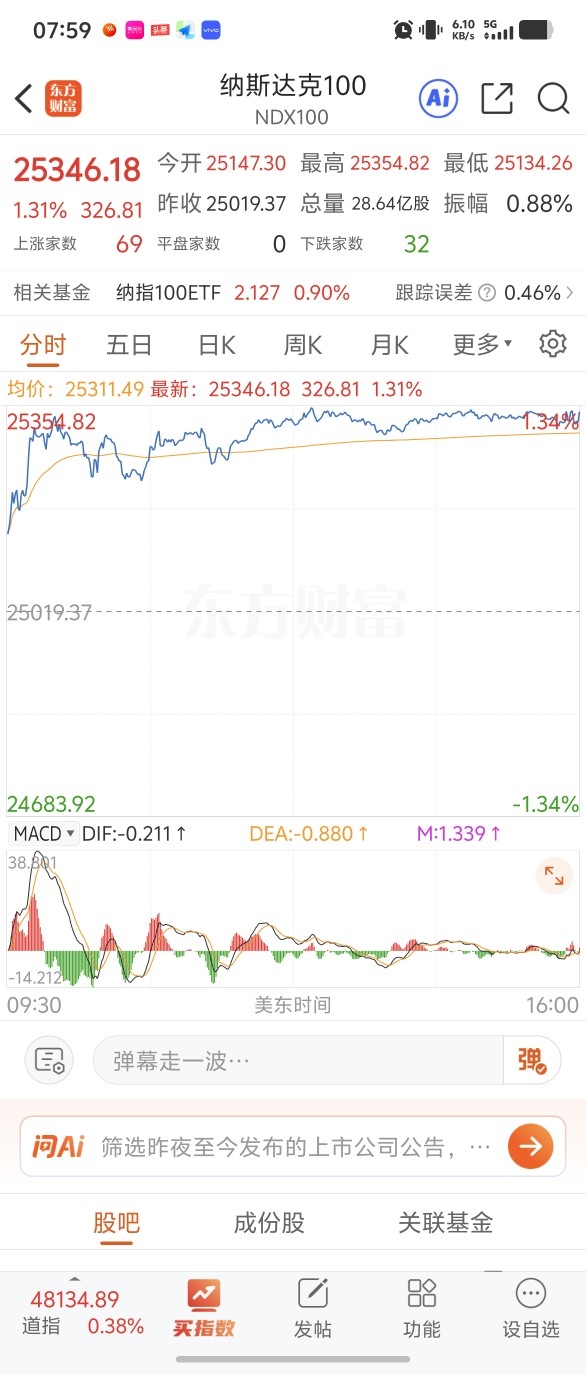 板块方面,半导体,生物科技涨幅最大,均超2.5%,其余涨幅均不大,还好,咱们目前基本就持有这两个。大型科技股方面,英伟达,博通领涨,meta,特斯拉小绿,特斯拉前几天很猛,今天歇一歇了。
