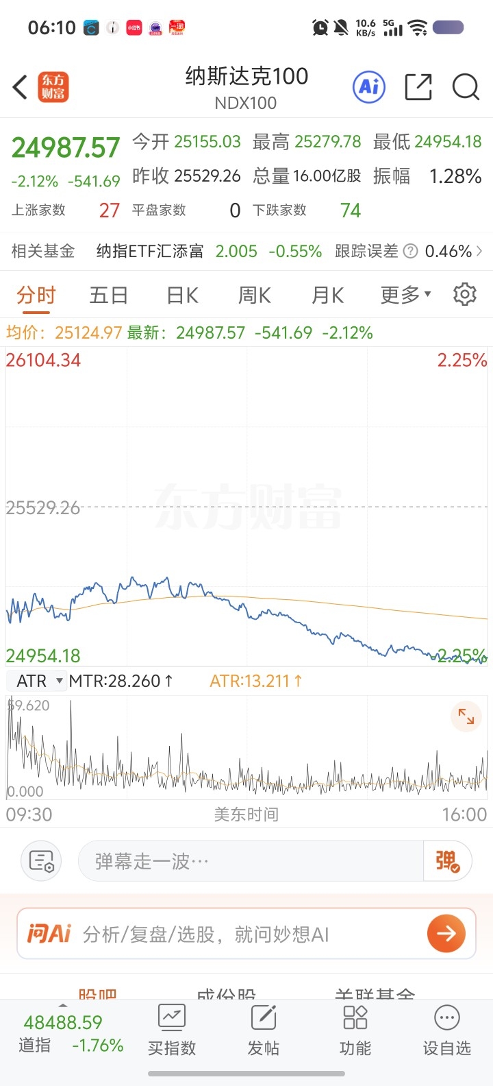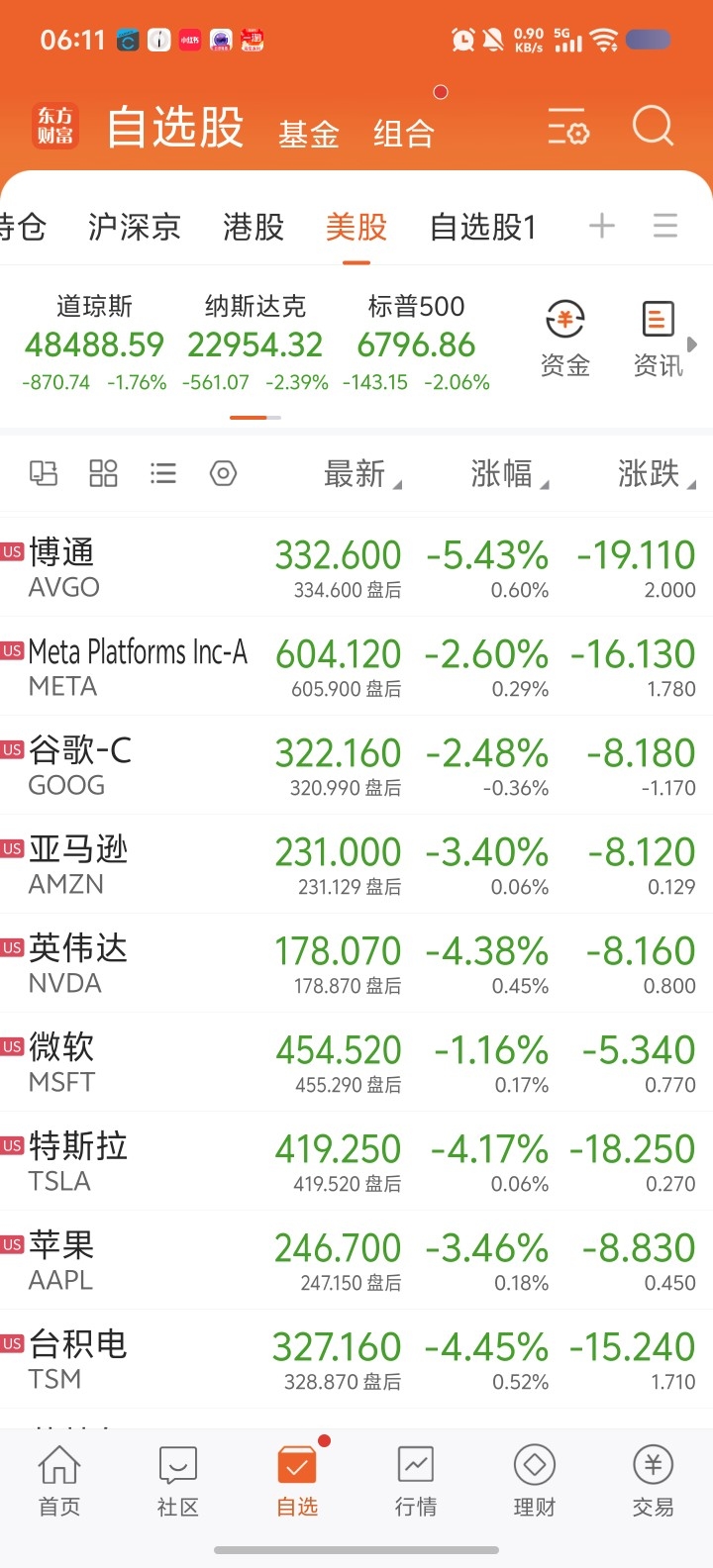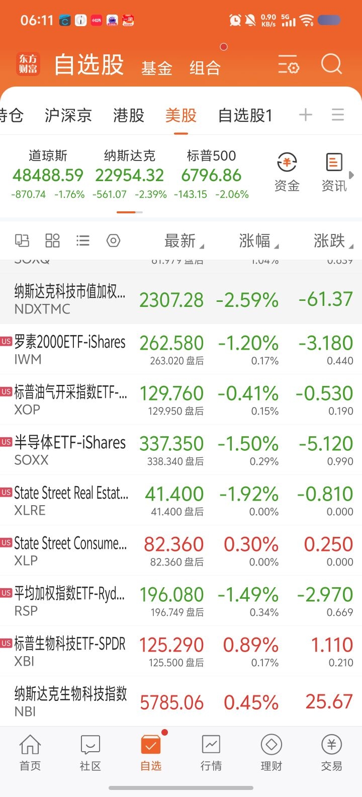 截至收盘,道琼斯指数跌1.76%,报48,488.59点;标普500指数跌2.06%,报6,796.86点;纳斯达克指数跌2.39%,报22,954.32点。
