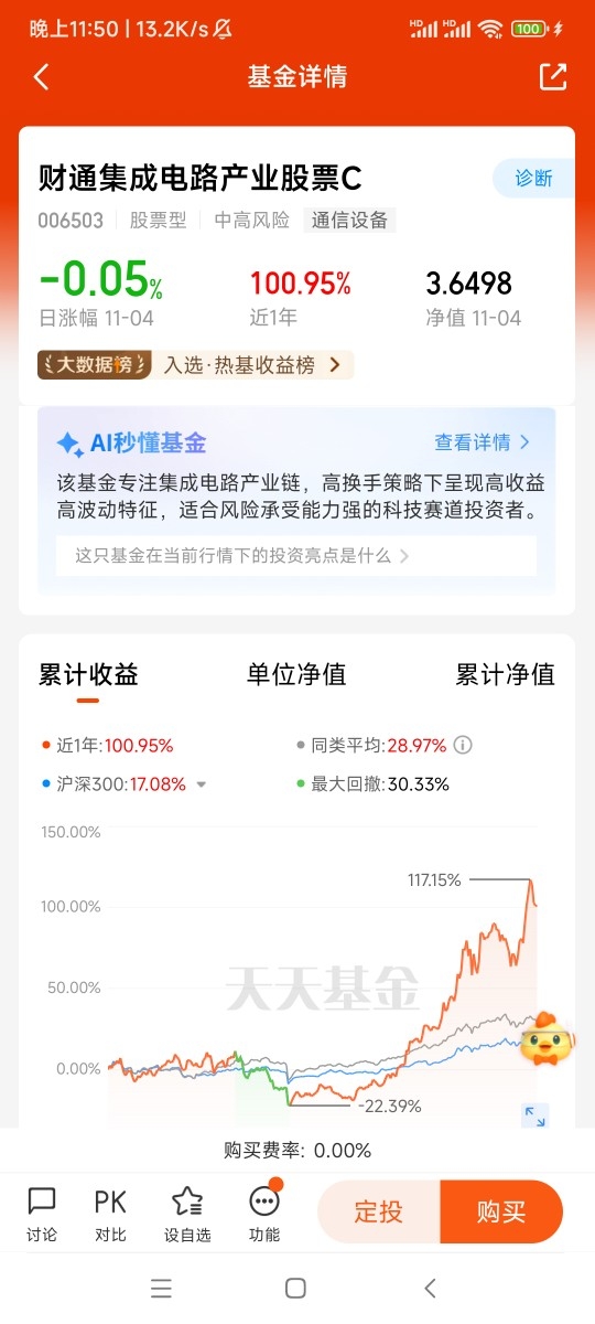 在数字经济加速渗透的时代背景下,集成电路产业的成长逻辑清晰而坚定,政策支持、需求爆发与国产替代三大主线将持续驱动行业前行。财通集成电路产业股票A(006502) 凭借精准的产业布局、优秀的管理能力与突出的业绩表现,成为衔接这一赛道机遇与投资者的优质桥梁。11月选择买入该基金,并以"长期持有+坚持定投"的策略应对市场波动,既是对产业趋势的坚定看好,也是对专业投资能力的充分信任。在投资过程中,需保持战略定力,忽略短期噪音,方能在产业成长的浪潮中收获长期价值。@财通基金