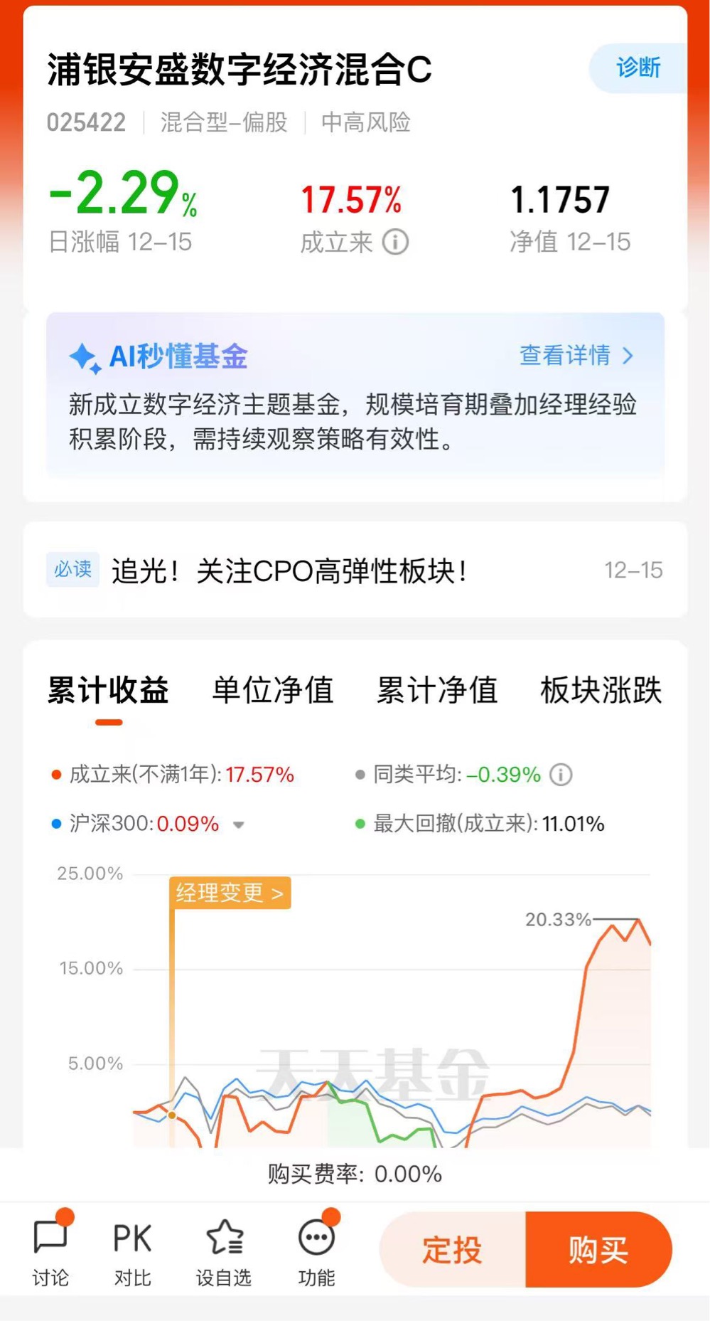 跌的少的CPO$浦银安盛数字经济混合C$,在车上的吃爽了,回调加少了呀,再跌我再