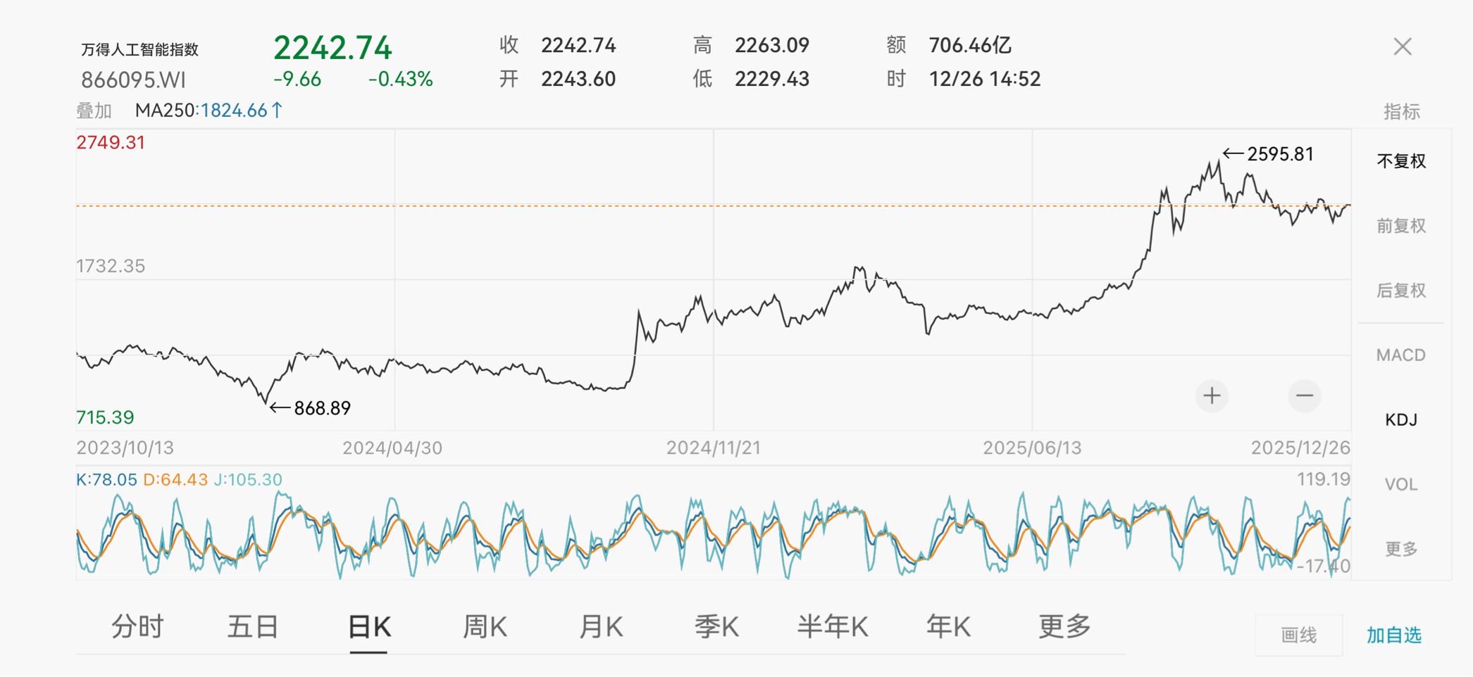 #“AI泡沫”还是“AI革命”?#自打2017年入市,这些年风风雨雨也算见过不少,更是打了无数次的3000点“保卫战”,我自己估摸着一只手都数不过来,哈哈。但像最近人工智能这么“疯”的板块,还真是好多年没见过了。从去年九月份开始,万得人工智能指数就跟坐上了火箭似的,一路往上冲,到10月9日那天,直接创下了2541.47点的历史新高,年内涨幅更是一度超过了50%,把其他主流指数远远甩在后头。这行情,看着账户数字跳动,心里是又爱又怕,爱的是它涨得猛,怕的是它涨得太猛,不知道什么时候会掉下来。手里的人工智能主题基金,到底是该继续拿着,还是该见好就收?这个问题最近反反复复在我脑子里打转。