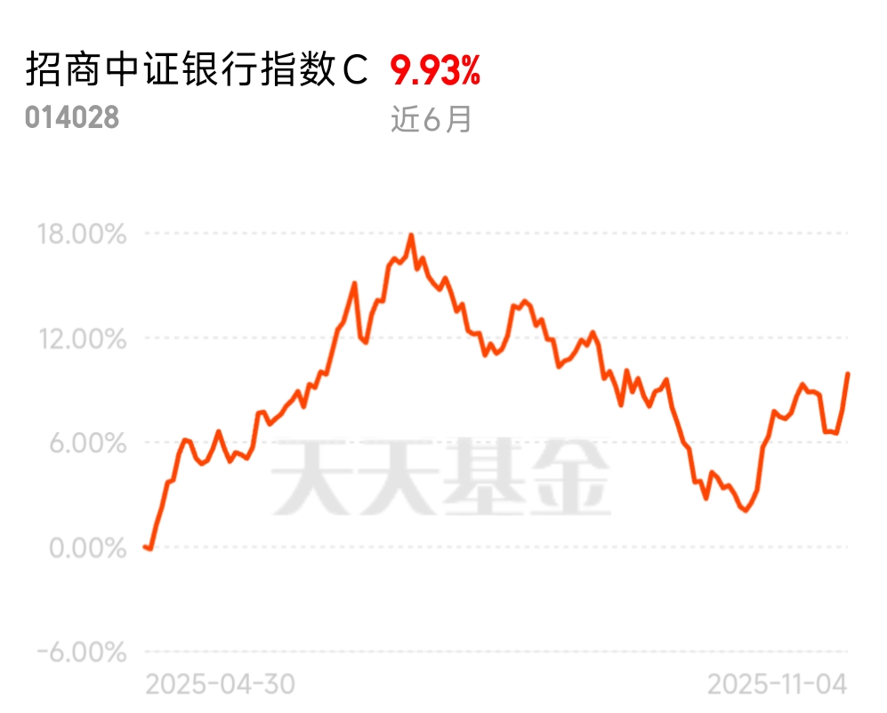 大伙都在找高股息的好机会,港股无风险收益率4~5%,境内不到2%,A股银行更值得投。招商中证银行指数C挺靠谱,近6个月涨了9.93%,可以关注起来。$招商中证银行指数C$