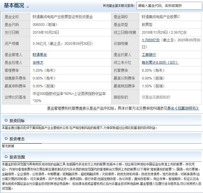 如果你对集成电路产业的发展前景看好,并且认可基金管理人的投资策略和过往业绩,那么财通集成电路产业股票C(006503)是个可以考虑长期持有的基金。不过投资都有风险,还是要结合自己的风险承受能力来决策。