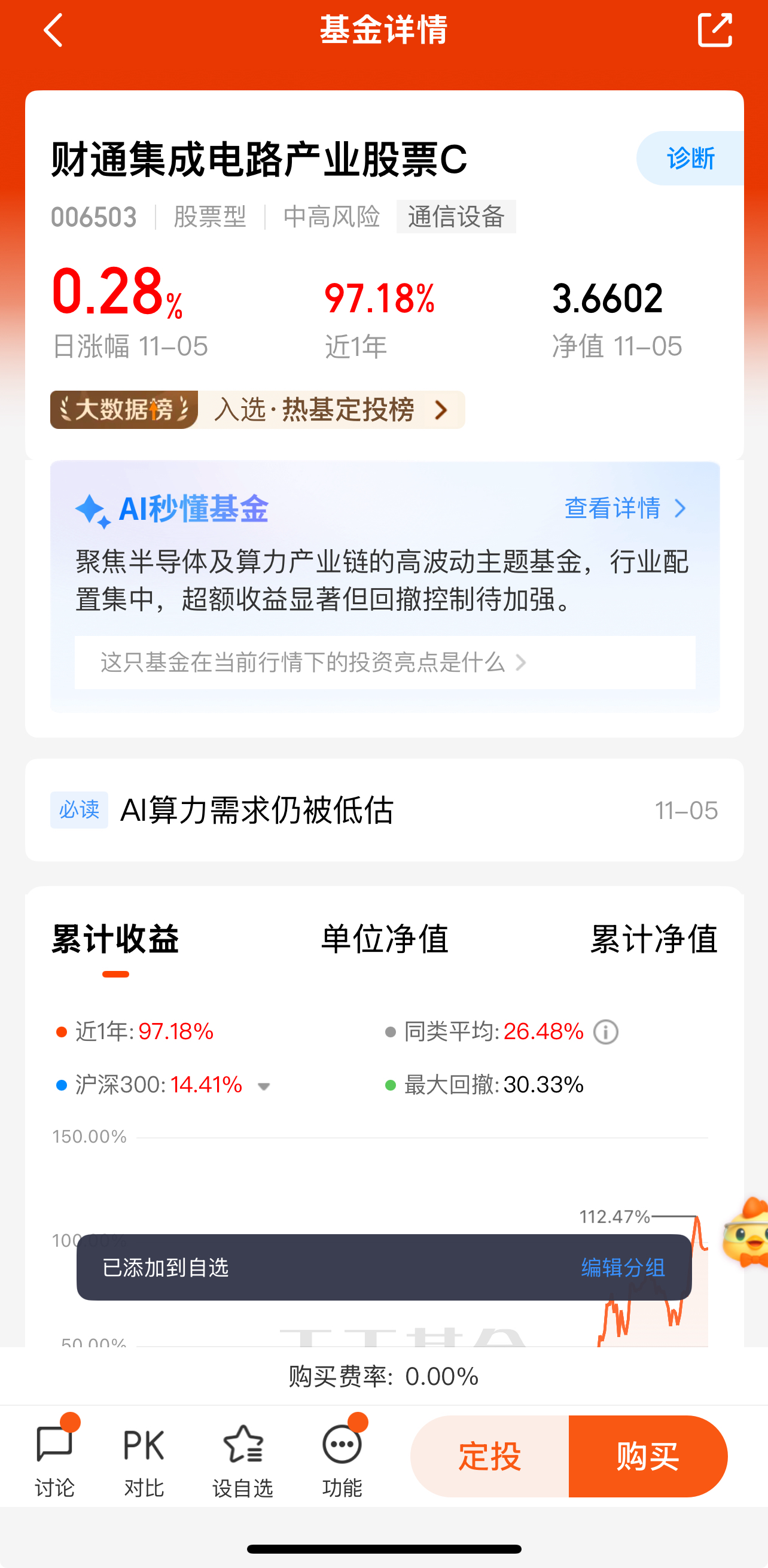 $财通集成电路产业股票C$ 这只基金属于股票型基金,波动可能会比较大。如果你能承受较大的风险,追求较高的收益,那它可能适合你。如果你是长期投资,看好集成电路产业的未来发展,那可以考虑逐步建仓;要是短期投资,可能得更关注市场的短期波动。