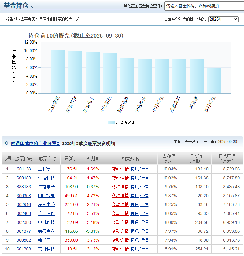 基金前十大重仓股涵盖了工业富联、生益科技、生益电子等,涉及集成电路产业的多个领域。这些行业的发展前景还是很不错的,像半导体芯片是科技领域非常重要的一环,几乎所有的科技细分领域都离不开它的支持,包括这两年兴起的AI、机器人、智能汽车等新兴产业,都涉及到半导体芯片,所以从长期来看,集成电路产业的发展空间比较大。