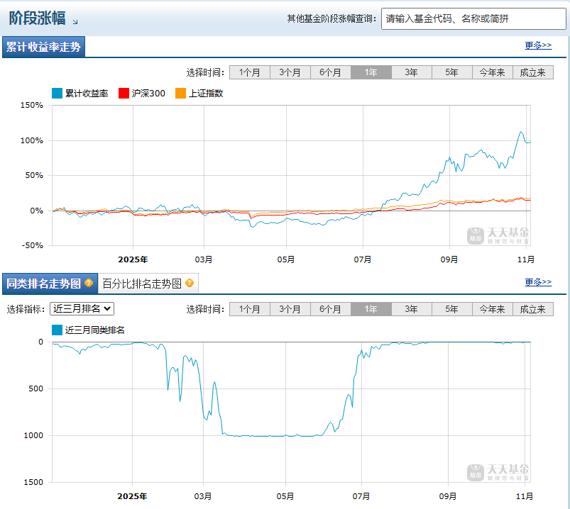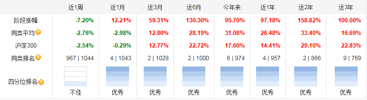 从历史表现来看,该基金在同类基金中排名较为靠前。近1月收益达到12.21%;近3月收益达到59.31%;近6月收益达到130.3%;近1年收益达到97.18%;近2年收益达到158.82%;近3年收益达到100%;近5年收益达到93.87%。今年来收益达到95.7%,值得注意的是从2018年11月29日至今收益率达到了266.02%。