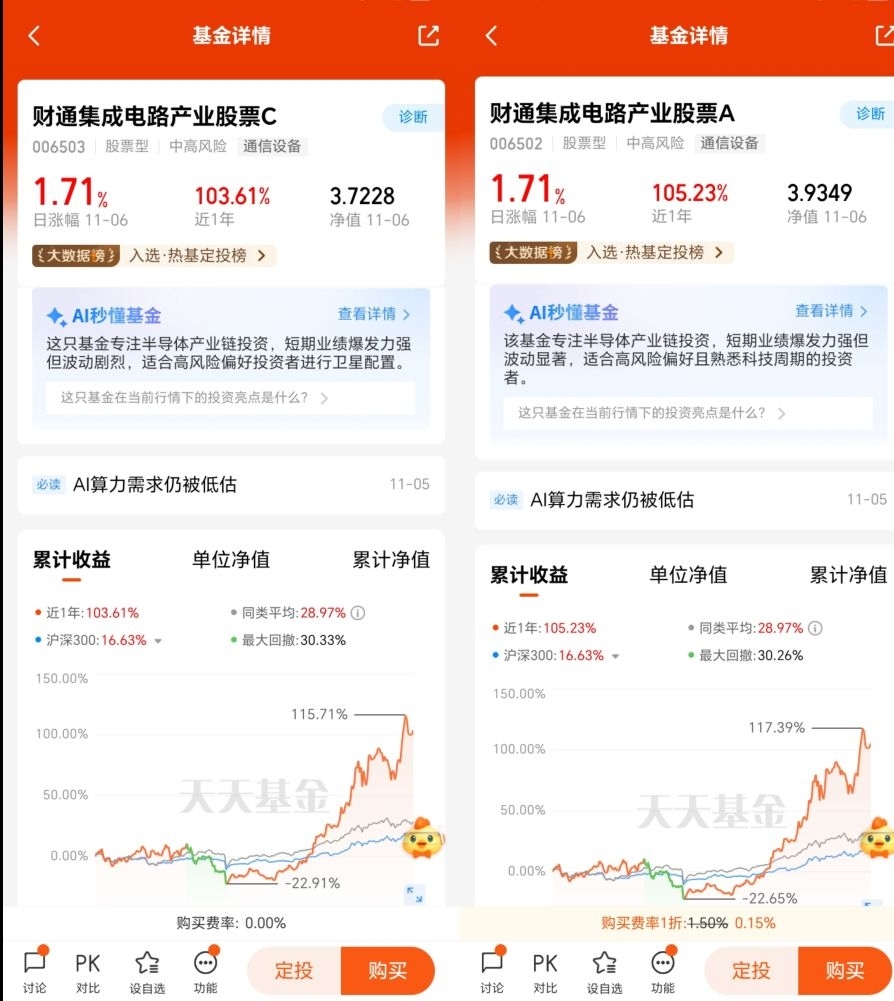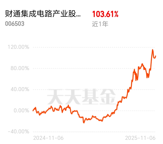 我关注了$财通集成电路产业股票C$ 。这只基金近一年收益103.61%,远超同类平均的28.97%,在晨星五星评级的加持下表现亮眼。基金专注半导体产业链投资,短期爆发力强,适合高风险偏好