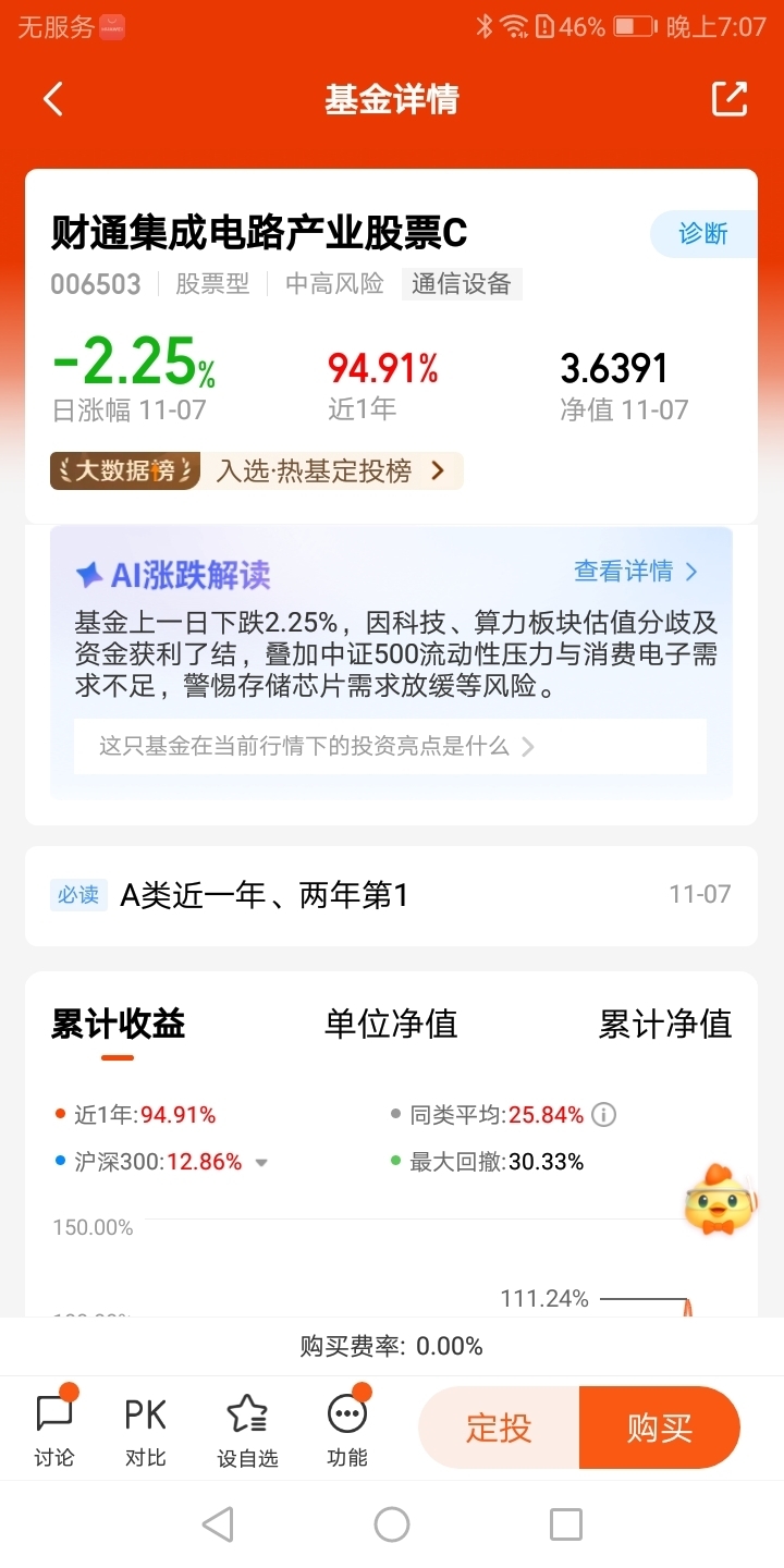 11月快要过半了,目前科技板块处于调整中,我认为目前是加仓的好时机,目前加仓总比它涨起来追高再加仓风险低。而且科技赛道未来几年都是市场行情中的主旋律。可以采取分批加仓,以免它继续下跌带来的亏损。$财通集成电路产业股票C$ @财通基金
