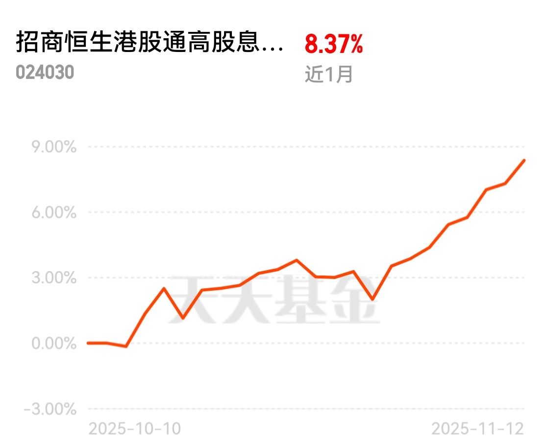 利率下行背景下,稳健收益的资产越来越抢手,港股高股息赛道热度居高不下。招商恒生港股通高股息低波动ETF联接C近1个月收益8.37%,跟踪的指数低波动特性突出,金融地产占比超60%,6%高股息+定期分红,低费率让长期持有更省心。$招商恒生港股通高股息低波动ETF发起式联接C$
