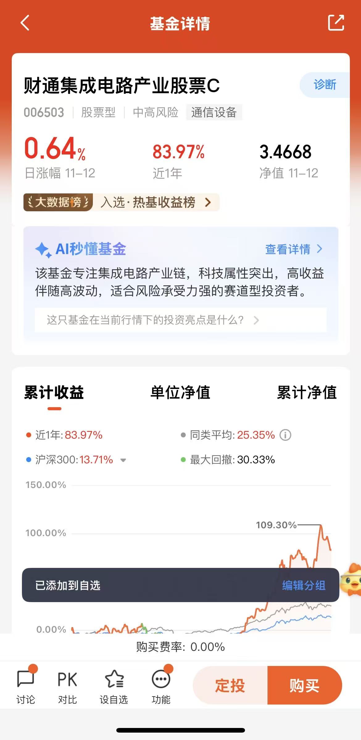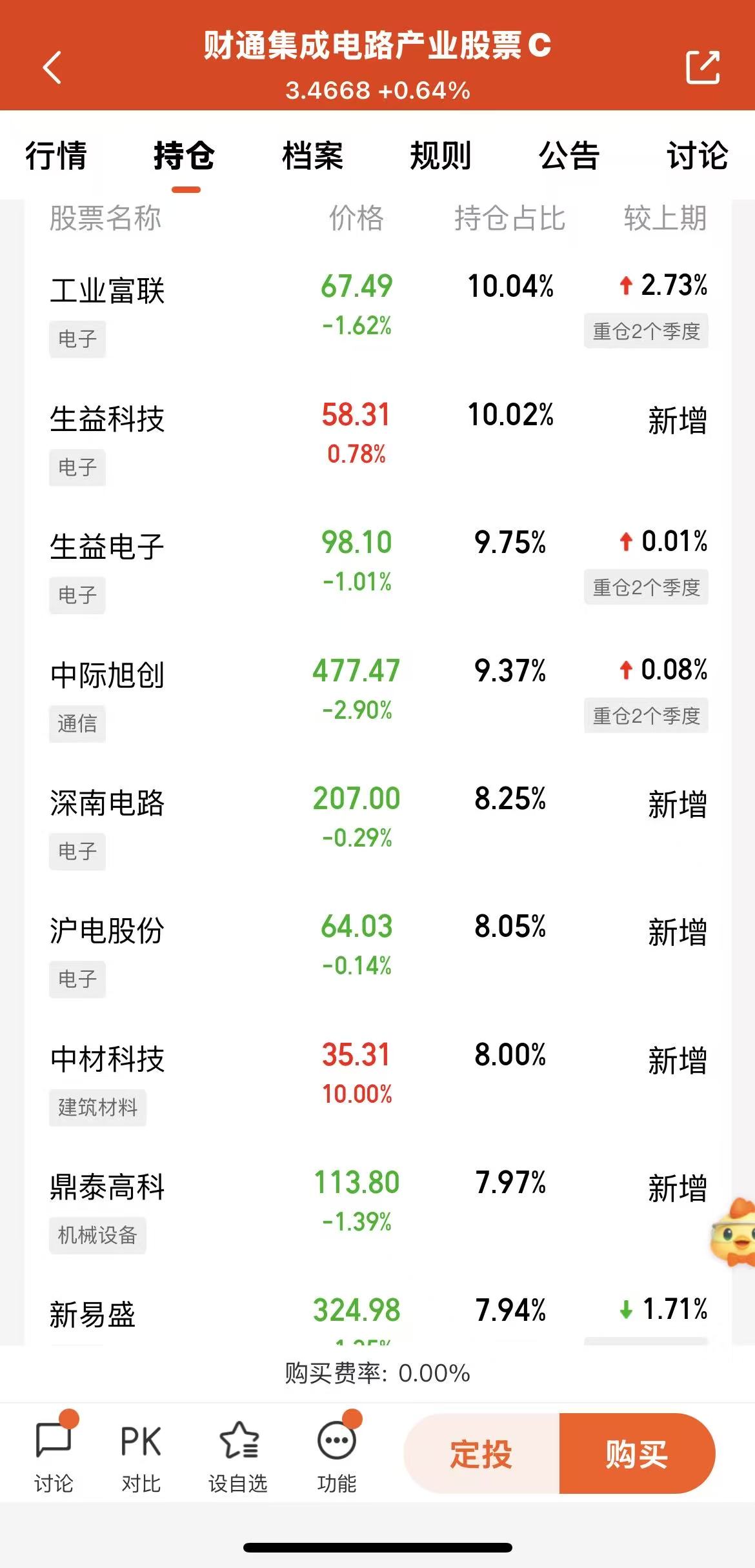 财通集成电路产业股票基金截至3季度,股票持仓达91.39%,一直以来表现优秀,作为股票型基金,在牛市的时候所向披靡,具有高高的阿尔法收益,如果是激进型的投资者,且对科技板块非常热衷,不惧怕较高波动和回撤的小伙伴们,真的适合切入这个基金,毕竟,金经理的投资能力和业绩有目共睹,与此同时,证监会近期也重磅发声,坚决防止市场大起大落,所以,当下这个时点,可以定投,我先买一点为敬。@财通基金 @财通基金 金梓才