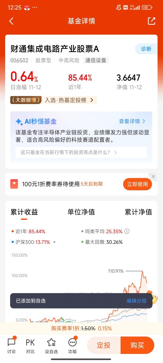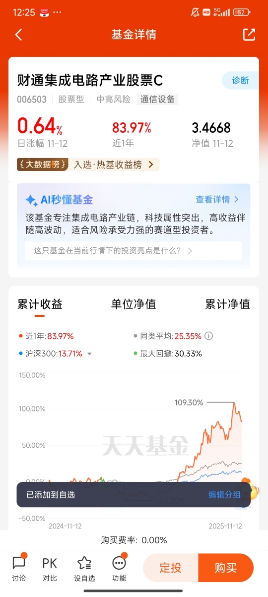 基于这个思路,我在11月的布局重点,就是精心选择前期涨幅不大、且重仓科技的优质基金。经过一番筛选和对比,我把目光放在了财通集成电路C和财通成长优选混合C这两只基金上。先说说财通集成电路C,这只基金主要投资于集成电路产业链相关的上市公司,涵盖了芯片设计、制造、封装测试等各个环节。但和其他一些重仓AI芯片、高端半导体的基金不同,它的持仓中也包含了不少与工业互联网、智能终端相关的芯片企业,这些企业前期涨幅相对温和,随着下游需求的逐步释放,未来还有不小的增长空间。而且作为C类基金,它没有申购费,赎回成本也较低,非常适合普通投资者进行波段操作和定投。