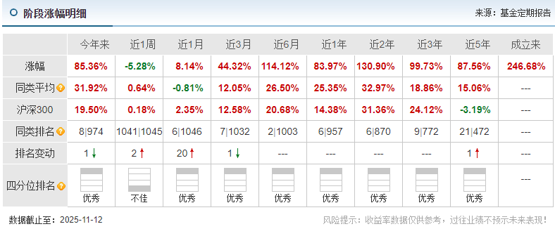 投资最终还是看能不能赚到钱,这只基金的收益数据真的很能打。截至2025年11月12日,这只基金今年以来涨幅高达85.36%,要是年初投10万,现在差不多能多拿8万5;成立以来更是涨了246.68%,相当于投10万现在能赚24万多,比存银行、买理财的收益高太多。再看中长期表现,近一年收益83.97%,近三年也有99.73%,不管是短期冲收益,还是长期做配置,都能拿到不错的回报。这种实打实的收益,不是靠概念炒作撑起来的,而是跟着科技赛道和优质持仓慢慢涨上来的,咱们拿着也踏实。