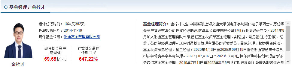 对咱们上班族来说,买基金其实就是买基金经理的判断力。金梓才经理的履历真的让人放心,上海交大微电子硕士出身,本身就是科技领域的专业人士,还做过TMT行业高级研究员,对科技赛道的理解比普通人深多了。他2014年就加入财通基金,从投资经理一路做到公司副总经理,在财通待了十几年,管理这只基金也快7年了,能够长时间稳定任职说明他接手后把基金打理得越来越好。其任职回报也很高,这种长期稳定的赚钱能力,让我们不用操心择时和选股。