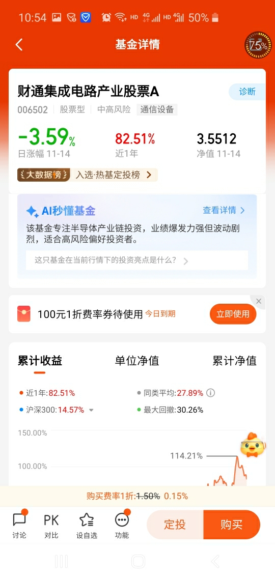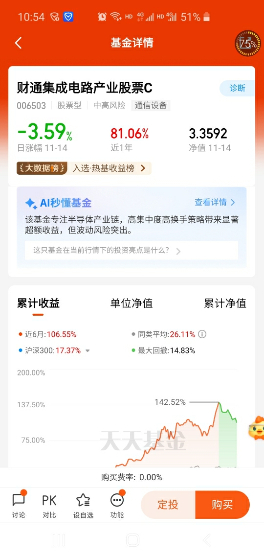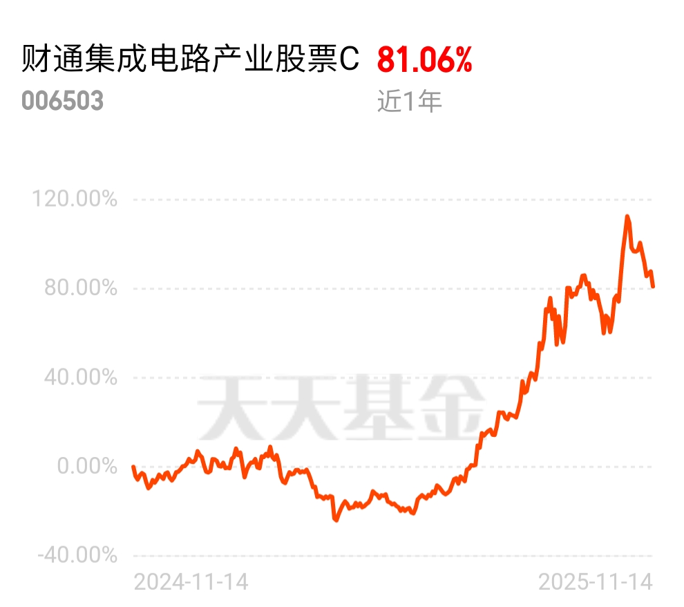 近1年收益81.06%,年2年收益121.8%,近3年收益96.07%,具备显著超额收益捕捉能力。$财通集成电路产业股票C$
