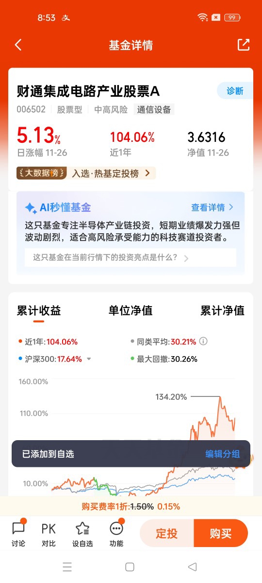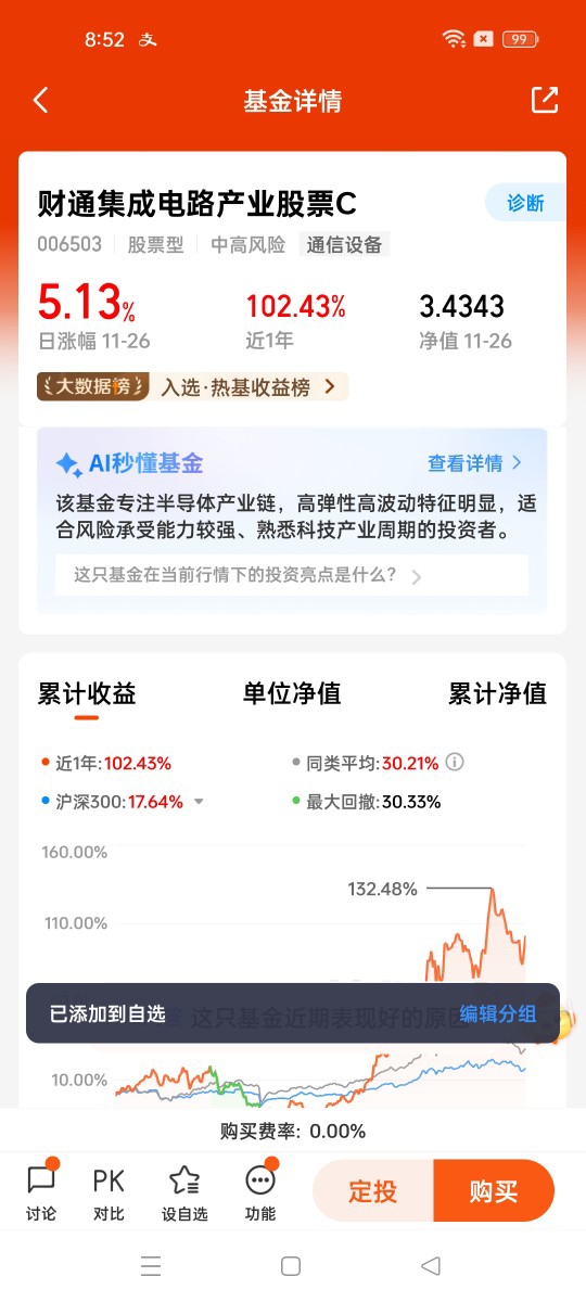 11月的科技板块正站在“估值合理+逻辑坚实+政策加持”的三重利好节点,半导体芯片作为核心赛道,成长确定性突出。$财通集成电路产业股票C$ 凭借高集中度的赛道布局、基金经理的专业投资策略,成为把握这一轮科技红利的优质工具。在投资过程中,投资者需坚守长期主义,匹配与产品风险等级相适应的投资心态与期限,方能在科技产业的发展浪潮中,收获超额收益。对于想要布局科技板块却缺乏专业选股能力的普通投资者而言,选择这样一只聚焦核心、策略清晰的基金,无疑是省心高效的投资选择。@财通基金