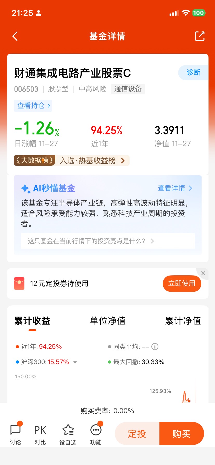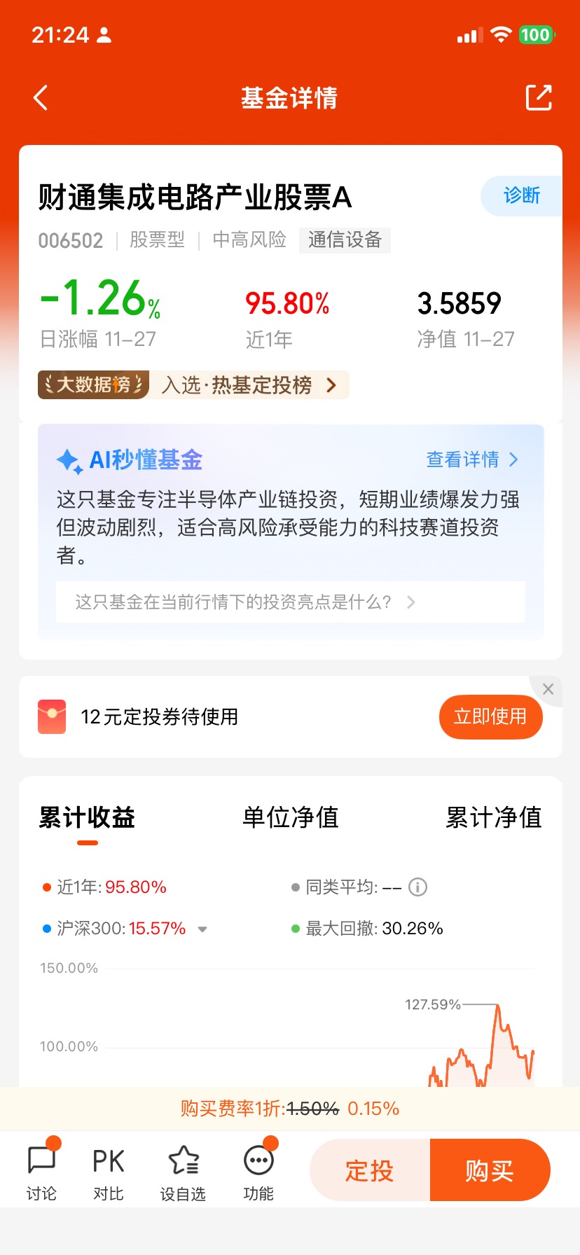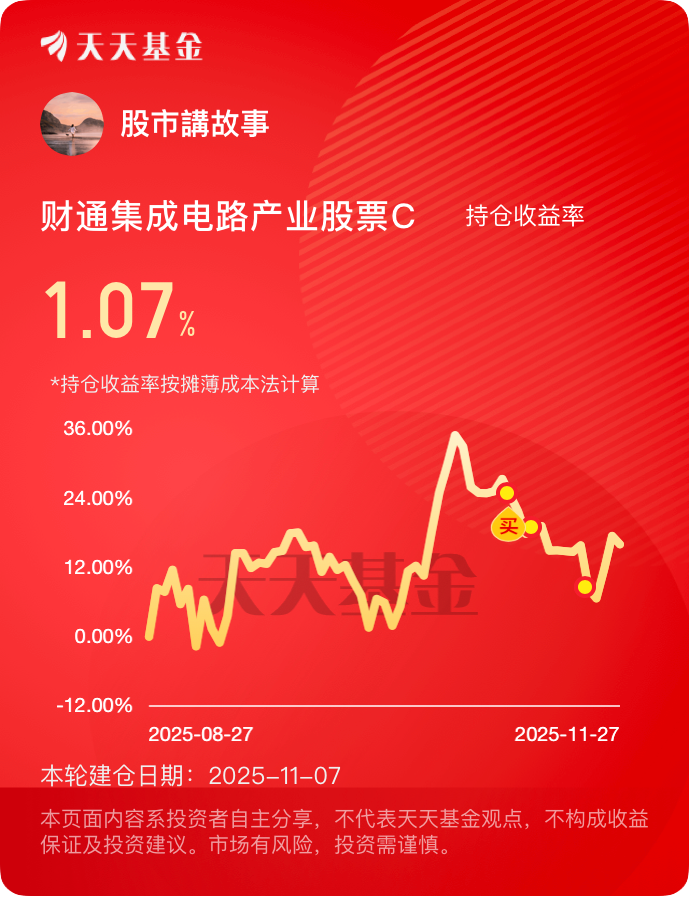 我找的方向是半导体,已经开始定投$财通集成电路产业股票C$ ,收益和体验都很好! @财通基金金梓才 经理管理的这只基金A类,聚焦半导体产业链,近六个月收益回报128.65%,夺得同类基金收益率冠军。