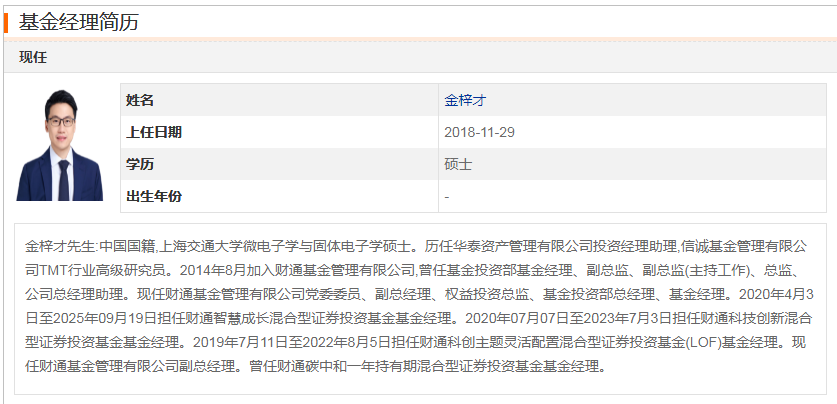 基金经理金梓才先生拥有上海交通大学微电子学硕士学位,15年从业经验,对科技产业有着深入理解,其管理的财通集成电路产业股票C基金近一年最大回撤为-30.33%,夏普比率1.64,体现了较高的风险调整后收益。