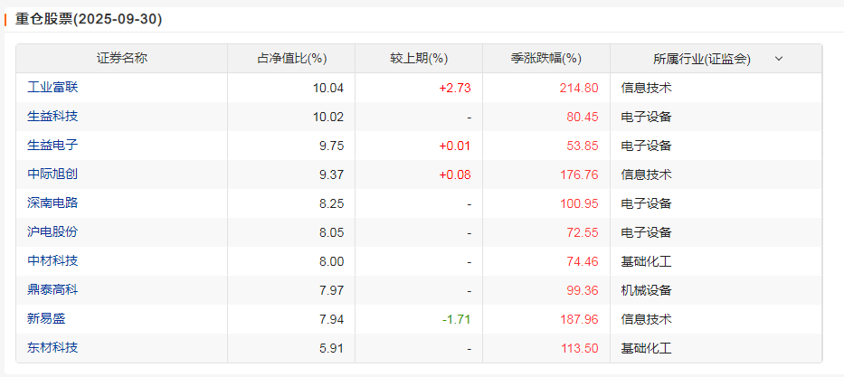 从持仓结构看,该基金前十大重仓股集中在光模块、通信设备、半导体材料等领域,如工业富联(10.04%)、生益科技(10.02%)、中际旭创(9.37%)、新易盛(7.94%)等,股票仓位高达93.03%。截至2025年11月14日,该基金重仓主板和创业板占比分别为37.35%和41.3%,显示出对科技成长股的深度布局。