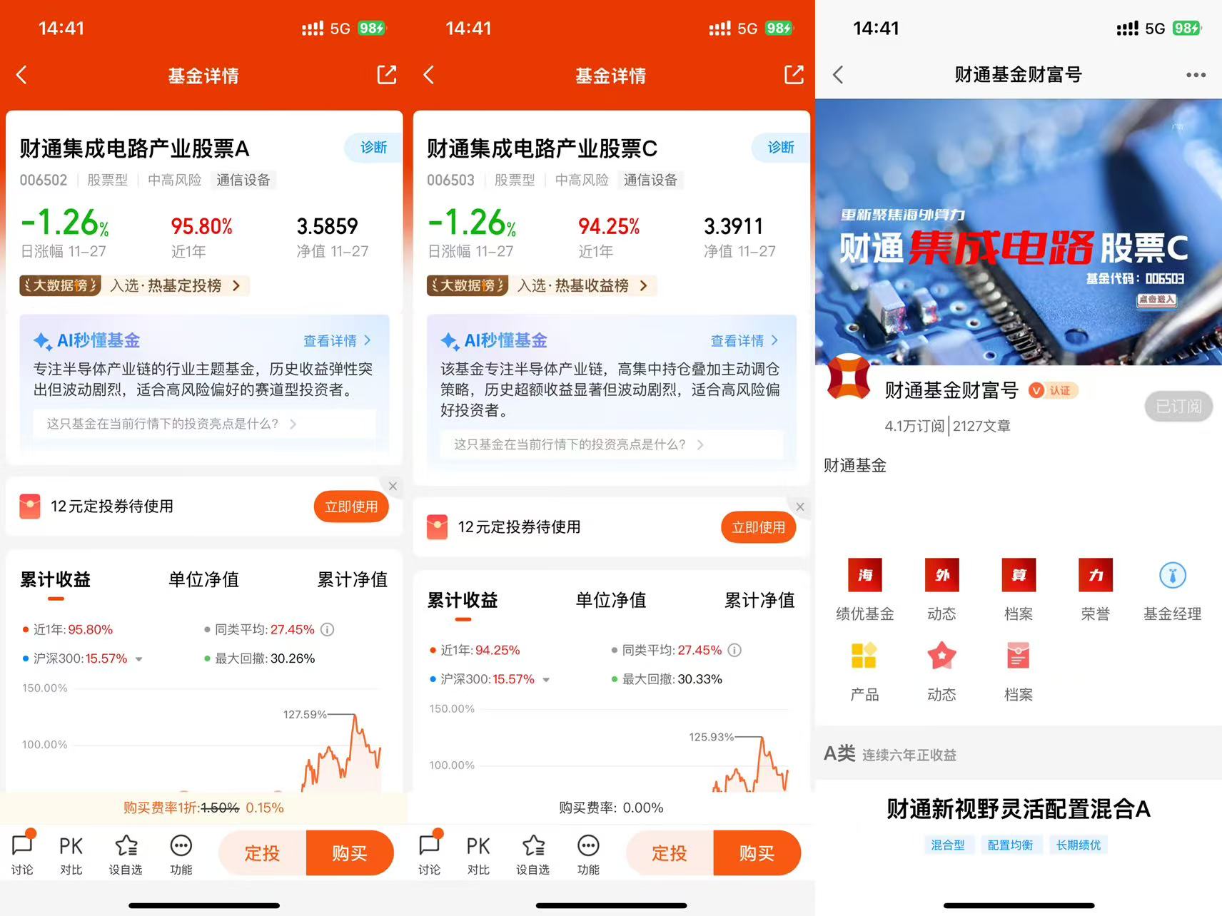 #11月基金投资策略#当前市场正处于政策空窗期与估值调整的叠加阶段,11月A股呈现”深强沪弱、结构性分化”特征,创业板与深成指领涨,而沪指震荡回落。在此背景下,财通集成电路产业股票C基金凭借其专注的科技投资赛道和出色的业绩表现,为投资者提供了把握政策驱动权益机会的优质工具。该基金成立以来收益率达235.92%,近一年收益91.87%,在同类基金中排名第一,展现出对科技产业趋势的精准把握能力。